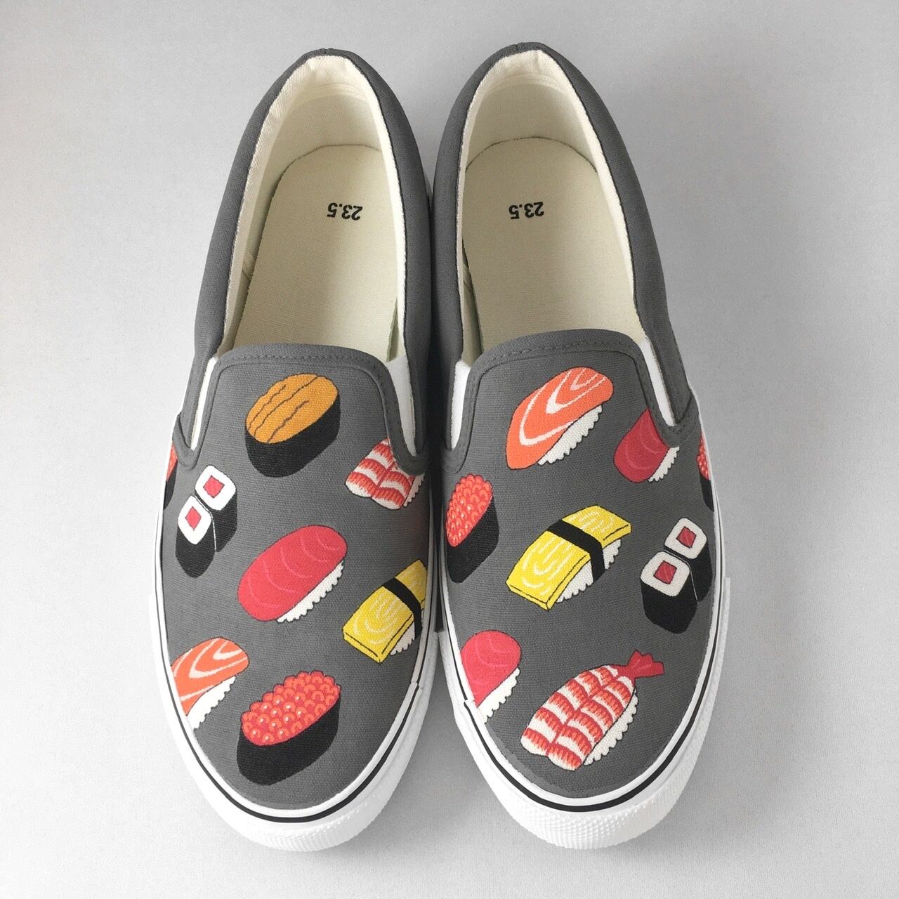 キャンバススリッポンに、手描きで【お寿司柄】をペイントした【LACICO(ラシコ)】のオリジナルハンドペイント作品です。