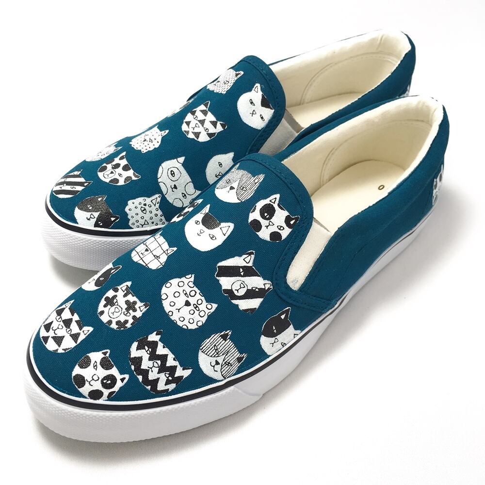 キャンバススリッポンに、手描きで『猫の顔イラスト柄』をペイントした【LACICO(ラシコ)】のオリジナルハンドペイント作品です。