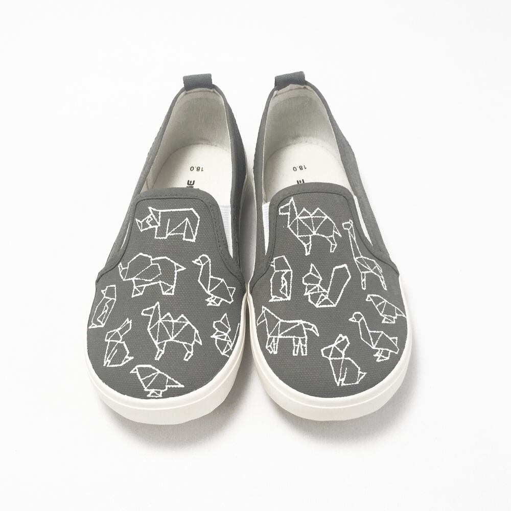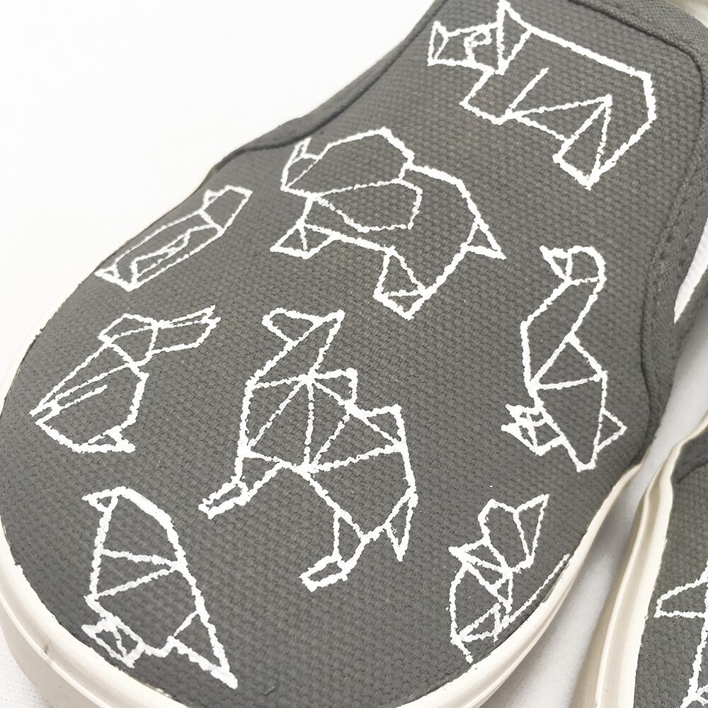 キャンバススリッポンに、手描きで『アニマル折り紙柄』をペイントした【LACICO(ラシコ)】のオリジナルハンドペイント作品です。