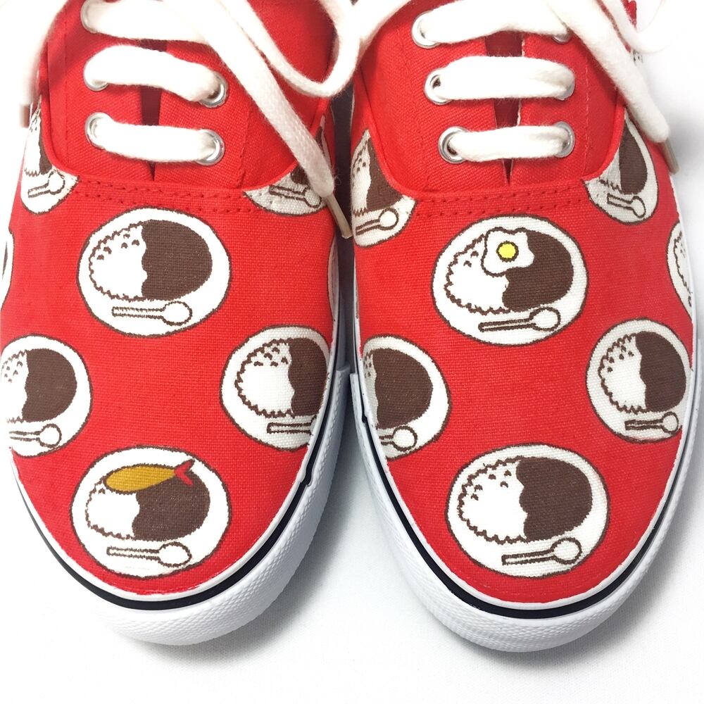デッキシューズに、手描きで『カレーライス柄』をペイントしたLACICOオリジナルハンドペイント作品です。
