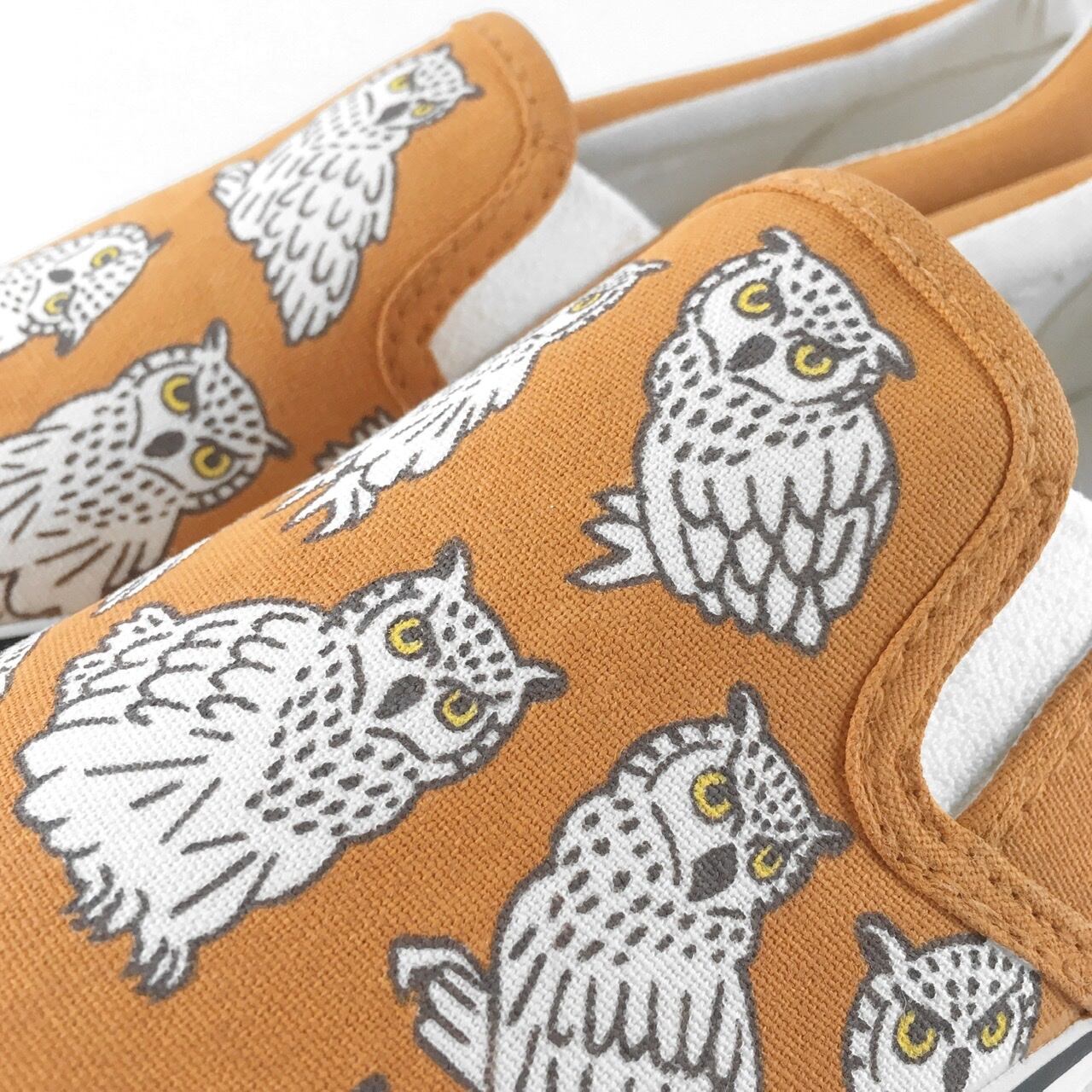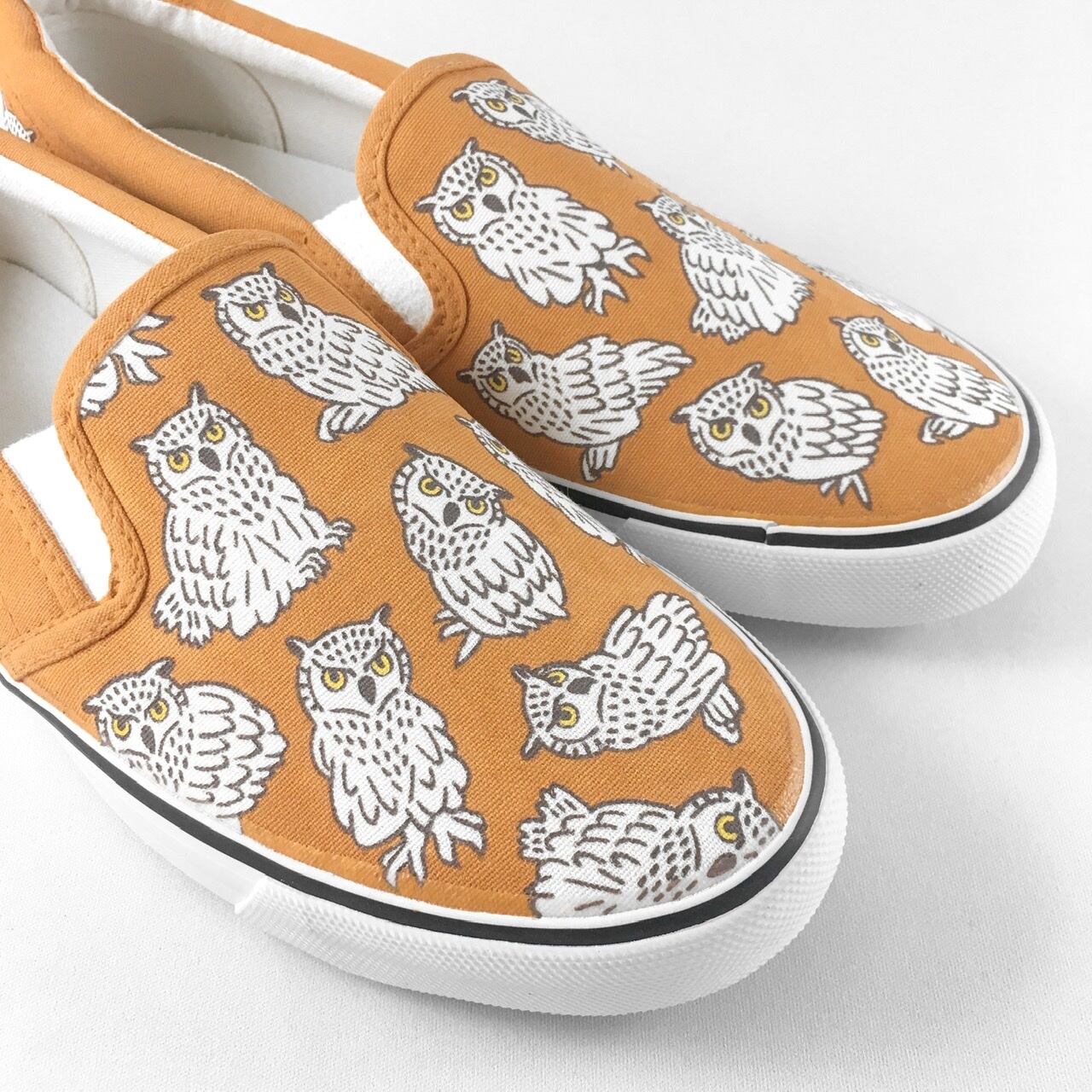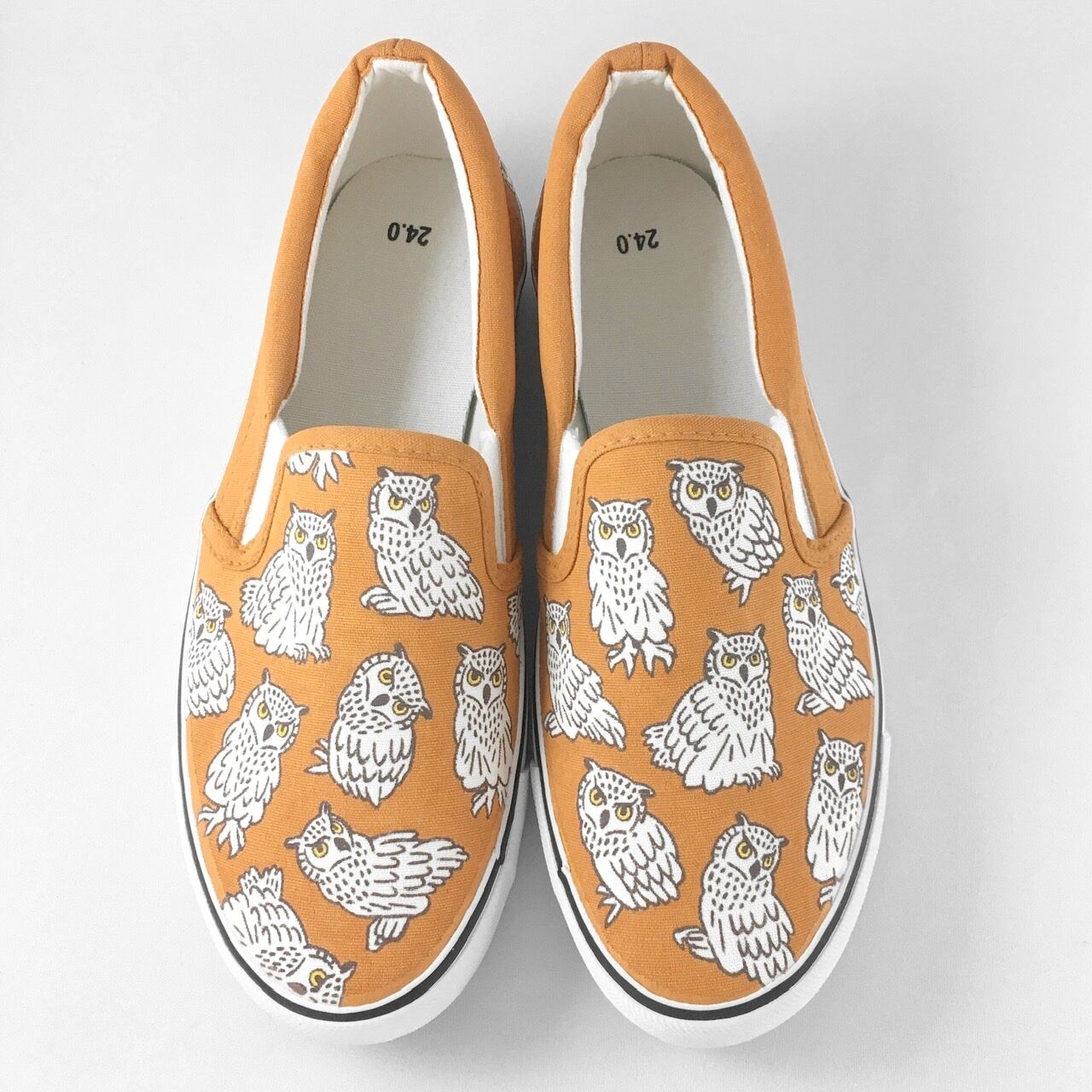 キャンバススリッポンに、手描きで『フクロウ(ミミズク)柄』をペイントした【LACICO(ラシコ)】のオリジナルハンドペイント作品です。