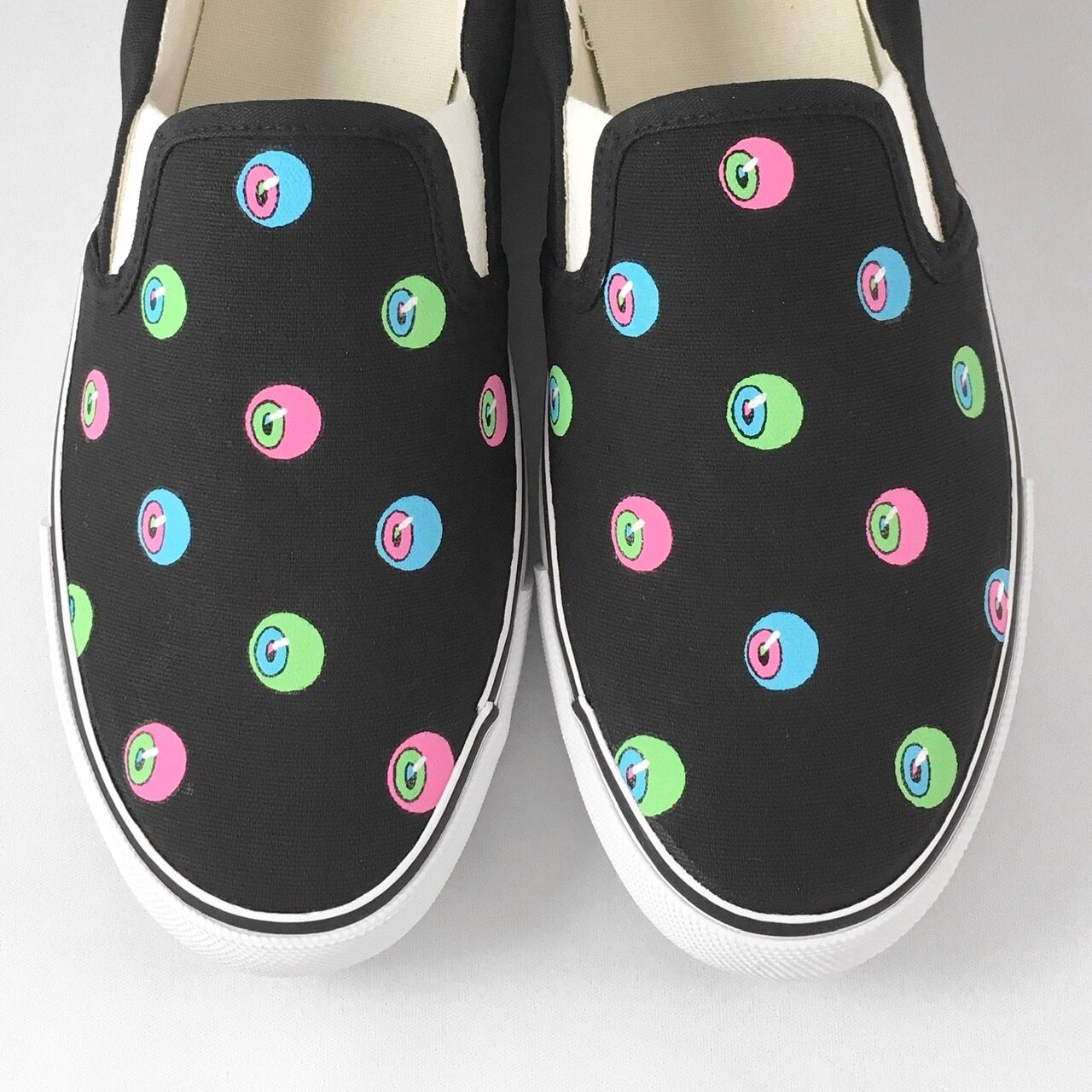 キャンバススリッポンに、手描きで「目玉柄」をペイントした【LACICO(ラシコ)】のオリジナルデザイン『EYEスリッポン』です。