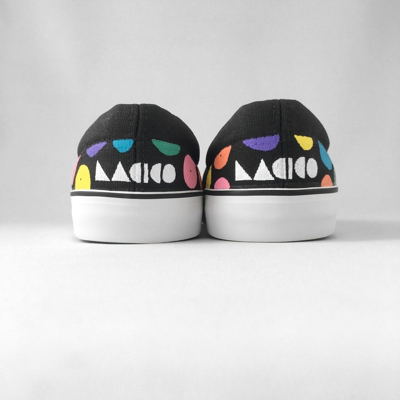 フリークライミングのトレーニングジム、ボルダリングクライミングジムに設置されているカラフルな「ホールダー」をスリッポンにペイントしたLACICO(ラシコ)のオリジナル手描き作品です。