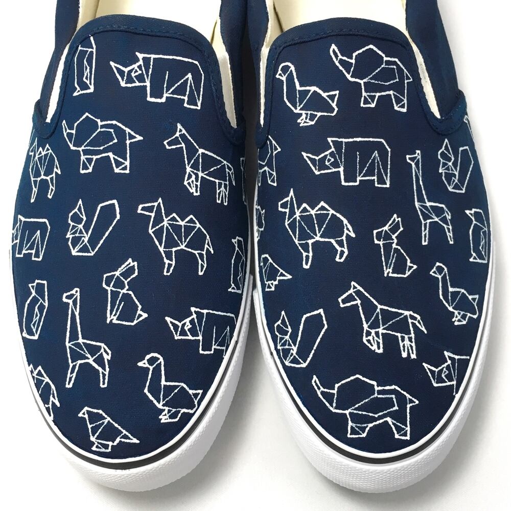 キャンバススリッポンに、手描きで『アニマル折り紙柄』をペイントした【LACICO(ラシコ)】のオリジナルハンドペイント作品です。