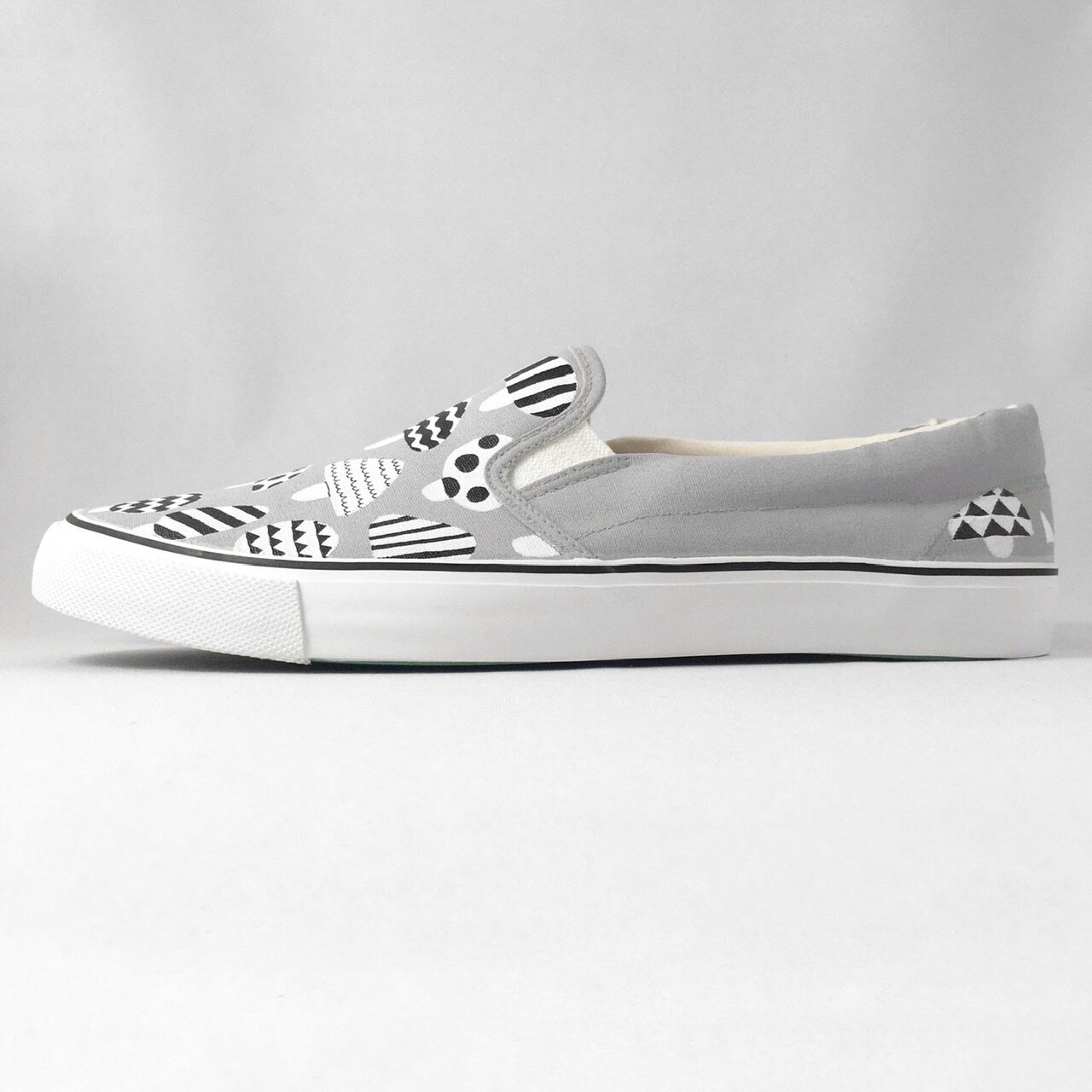 色々な模様のキノコを描き、ポップなスリッポンを目指しました。
