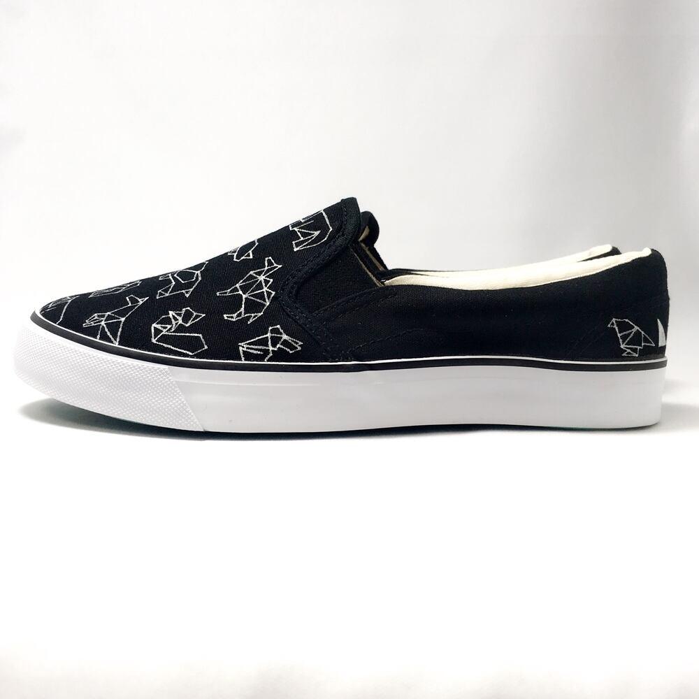 キャンバススリッポンに、手描きで『アニマル折り紙柄』をペイントした【LACICO(ラシコ)】のオリジナルハンドペイント作品です。