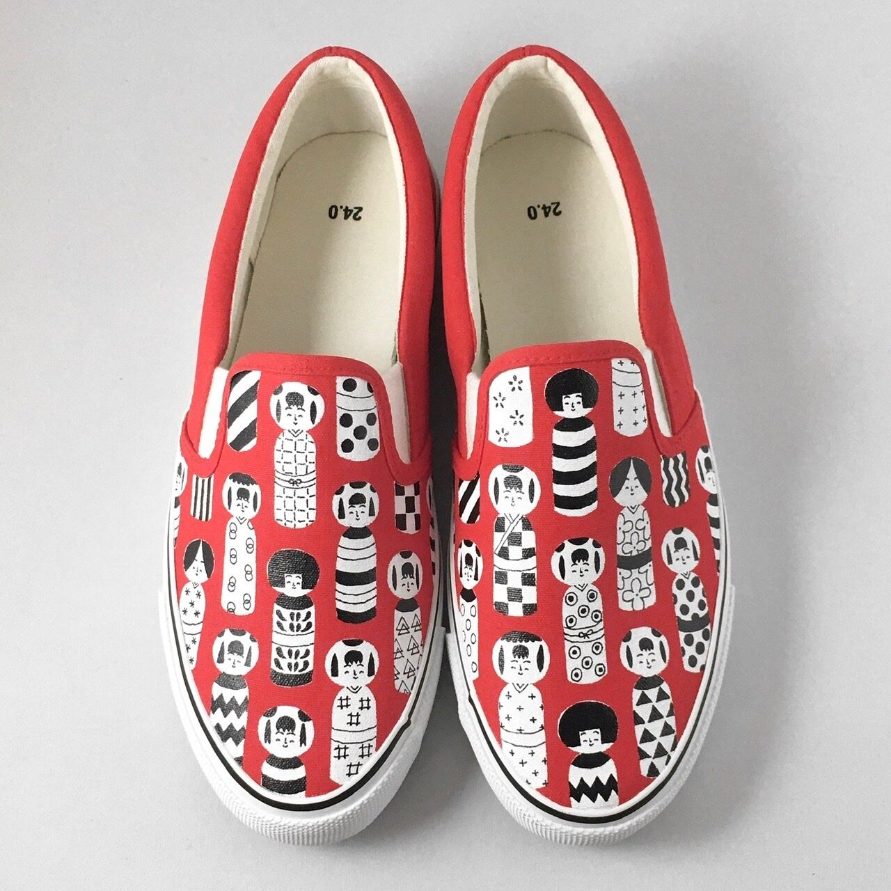 キャンバススリッポンに、手描きで『こけし柄』をペイントした【LACICO(ラシコ)】のオリジナルハンドペイント作品です。