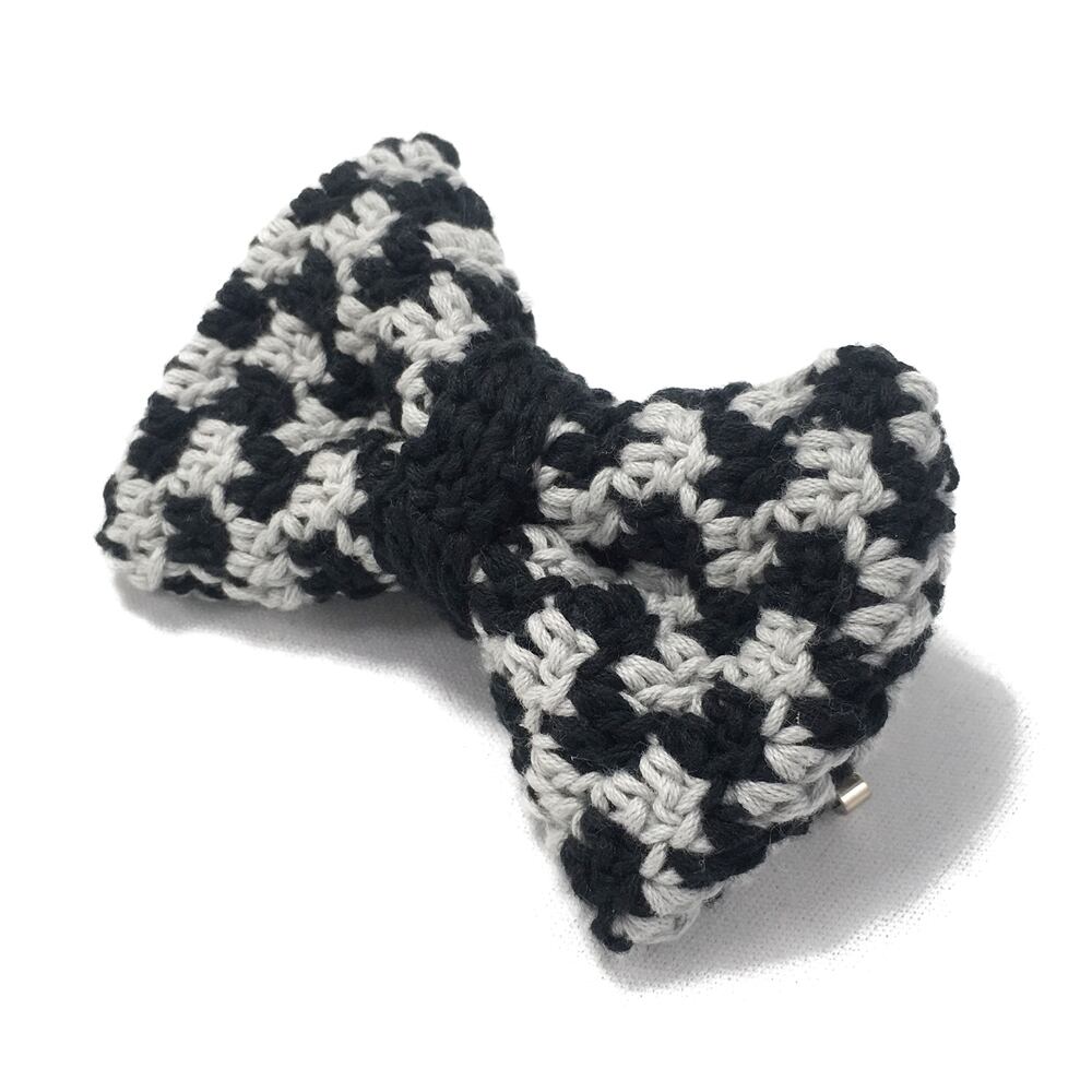 ドレッシーになりがちな蝶ネクタイをニットで編む事で、リラックスして普段使いできるアイテムに生まれ変わらせたユニークな作品です。