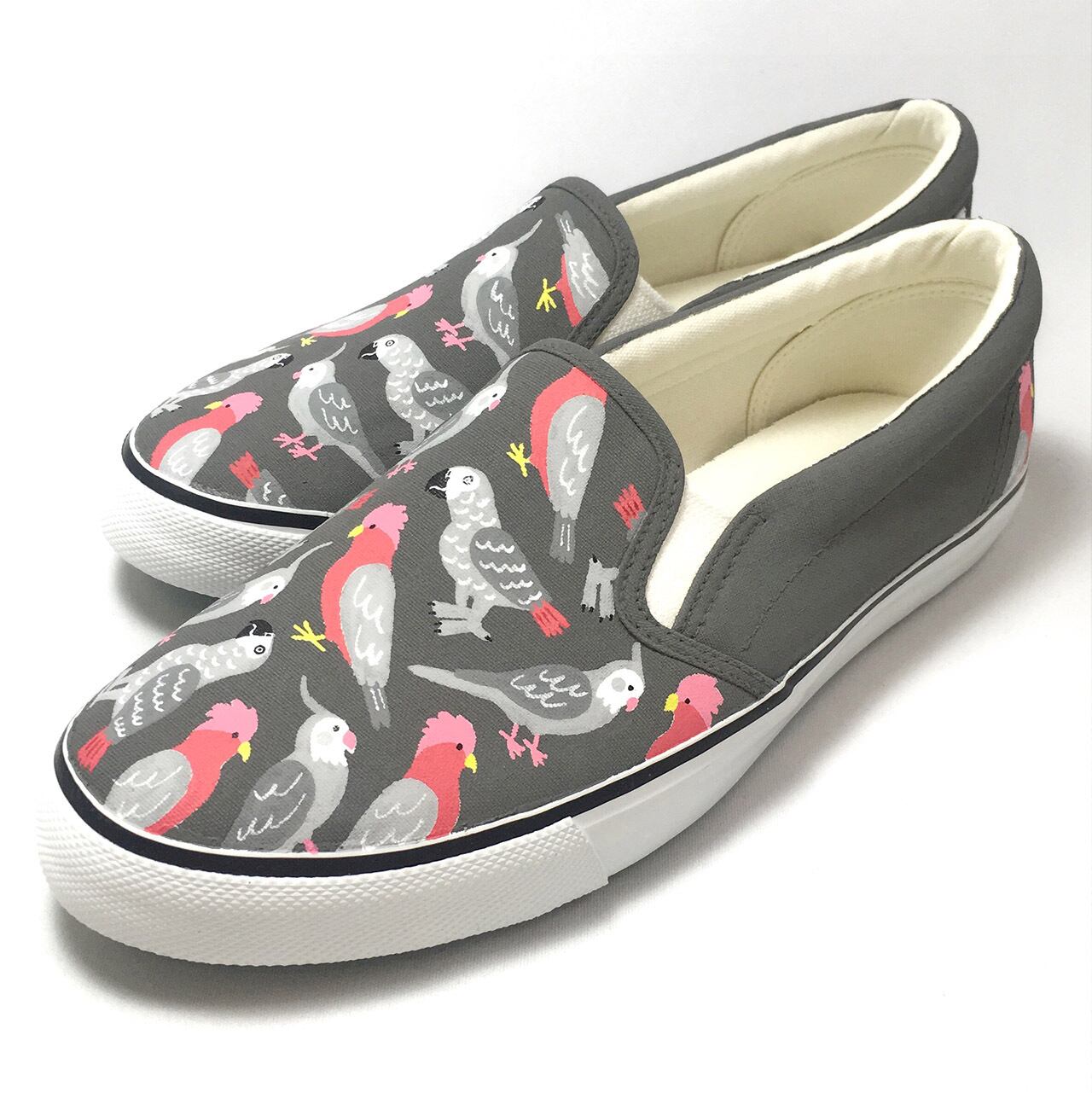キャンバススリッポンに、「ヨウム柄」に「オカメインコ」と「モモイロインコ」をペイントした『LACICO(ラシコ)』オリジナルハンドペイント作品です。