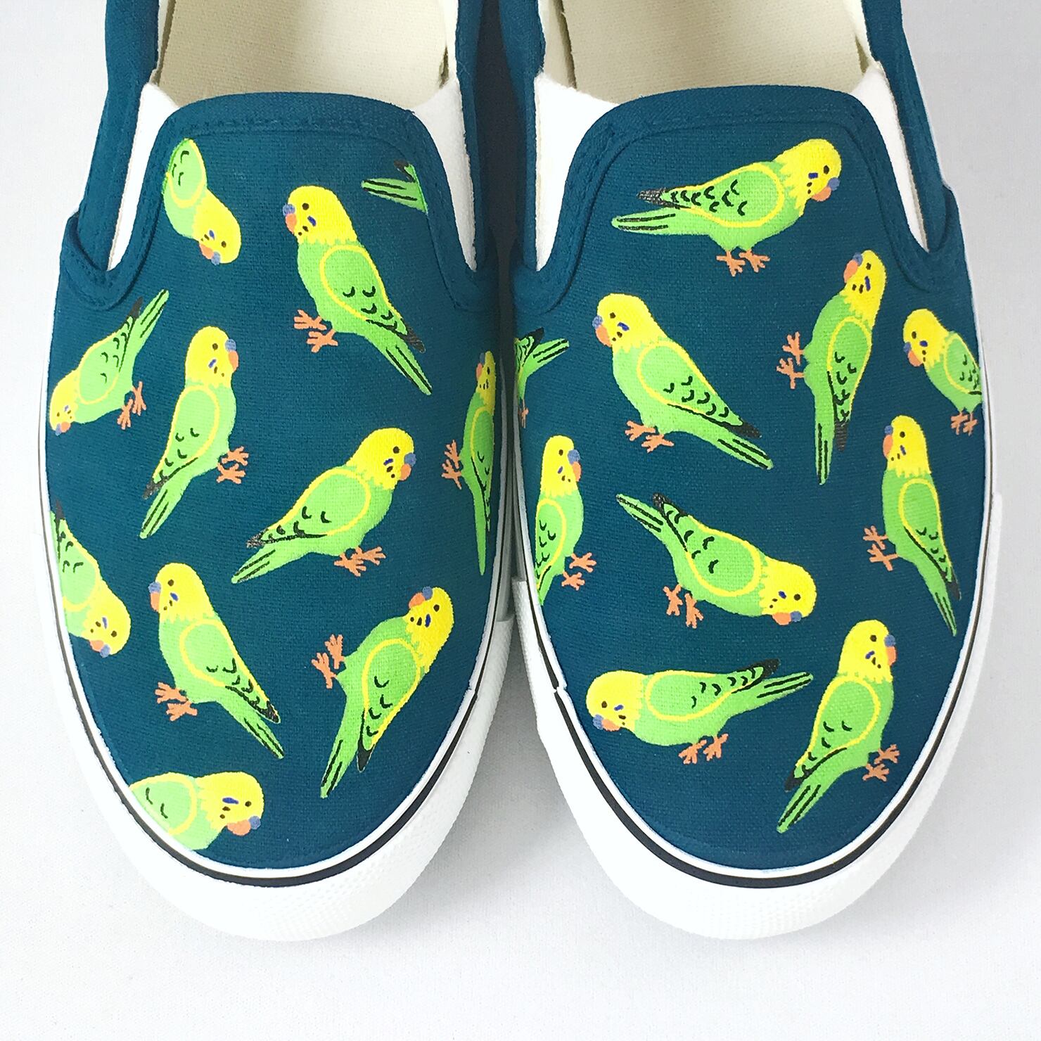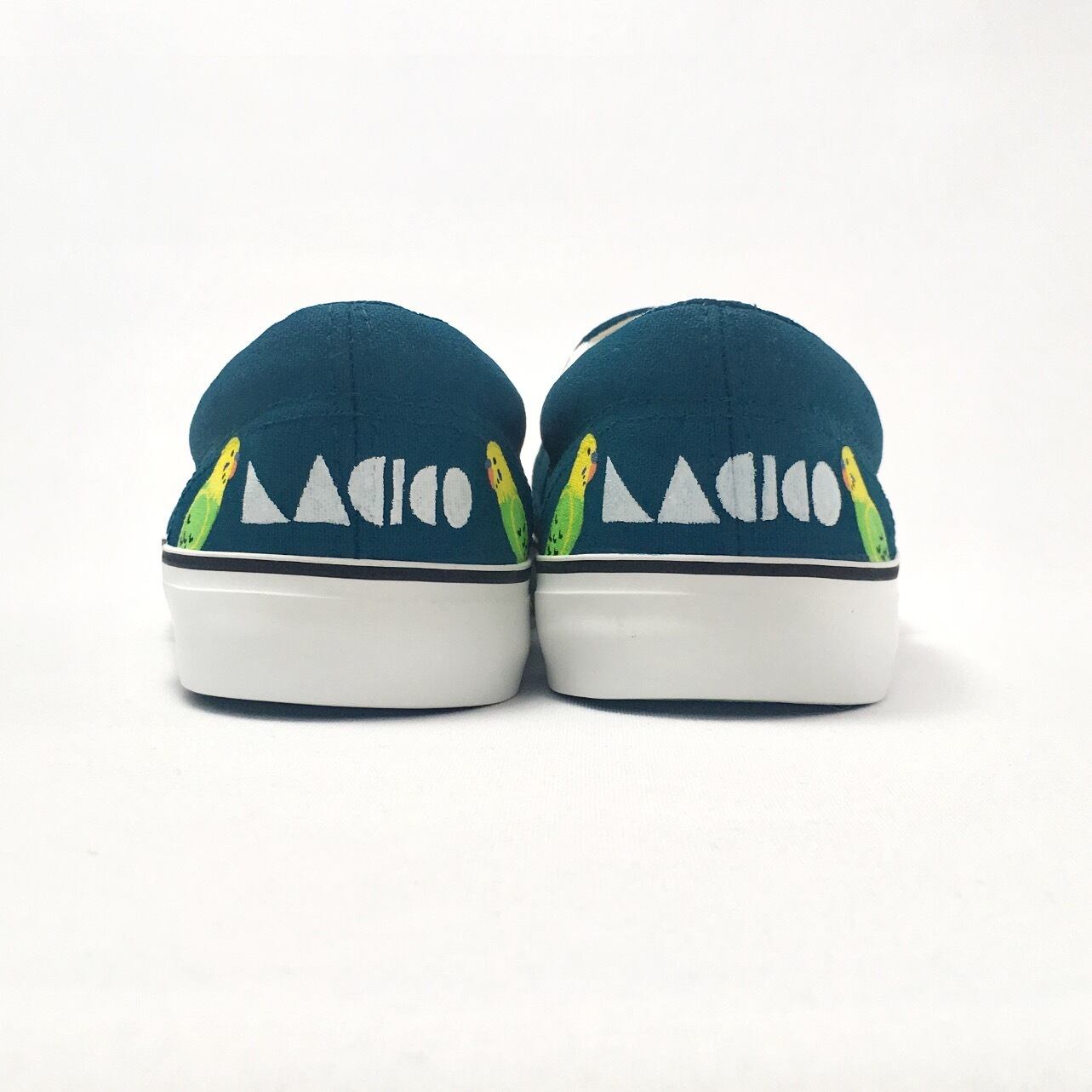キャンバススリッポンに、手描きで『セキセイインコ柄』をペイントした【LACICO(ラシコ)】のオリジナルハンドペイント作品です。