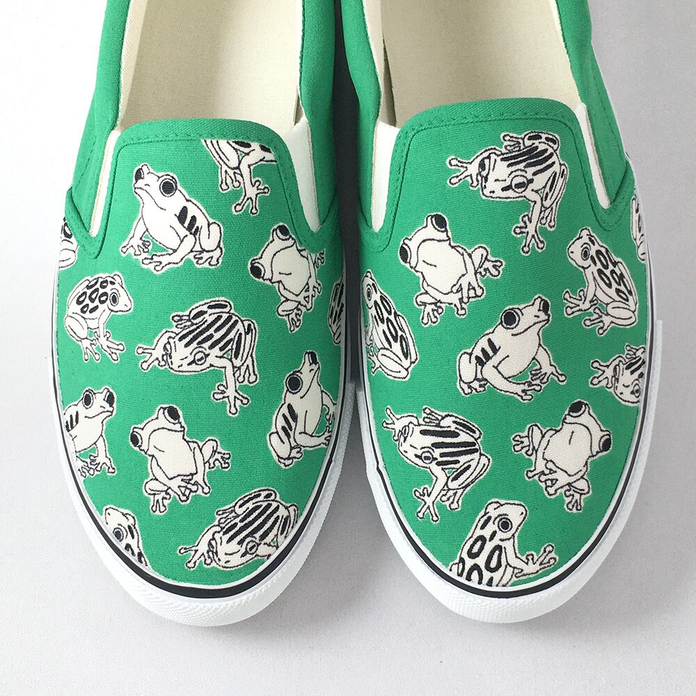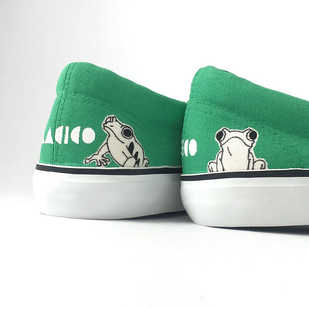 「カエル柄」をスリッポンにハンドペイントしたLACICOオリジナル手描き作品です。