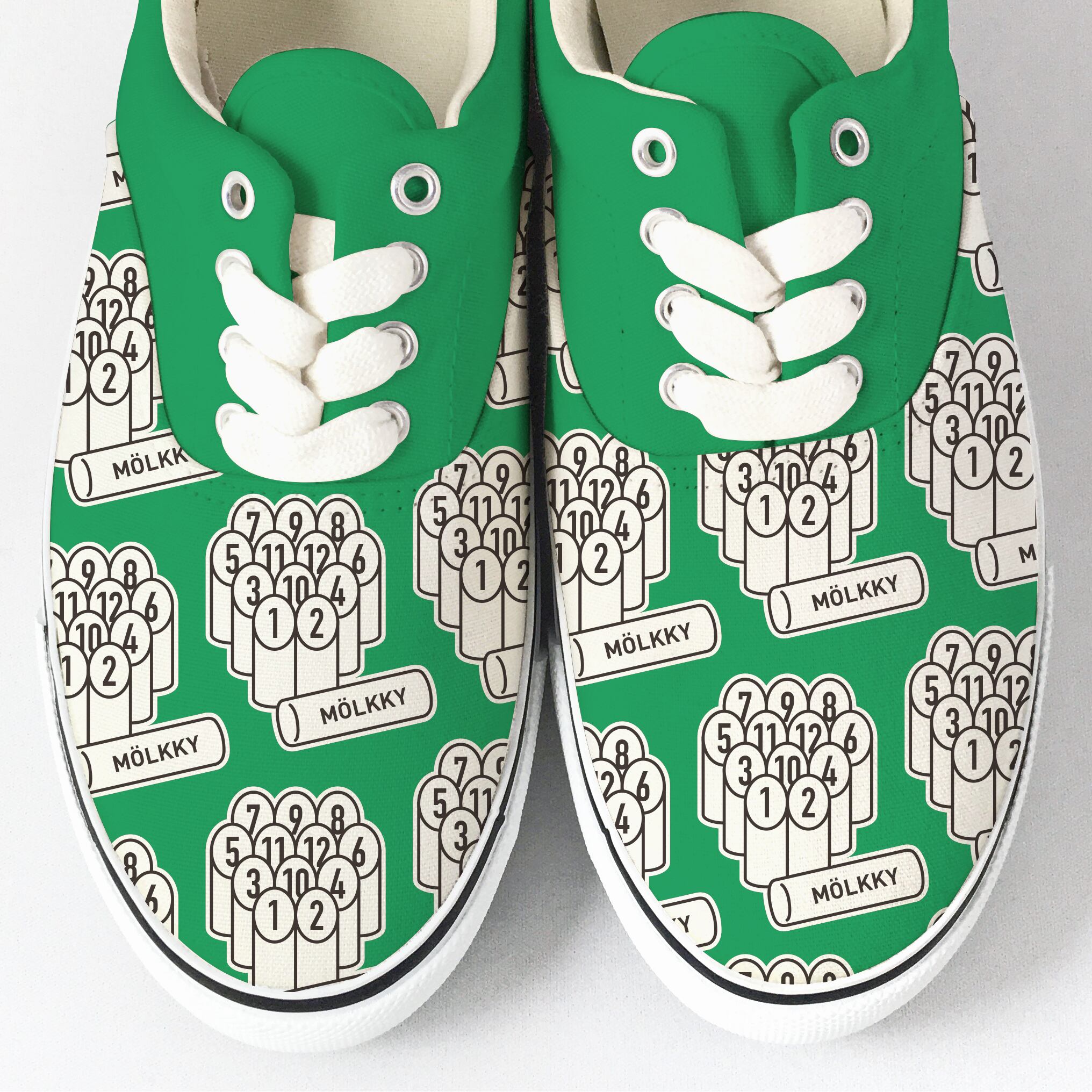 フィンランドのスポーツ『Mölkky(モルック)』柄をデッキシューズにハンドペイントしたLACICO(ラシコ)のオリジナル作品です。