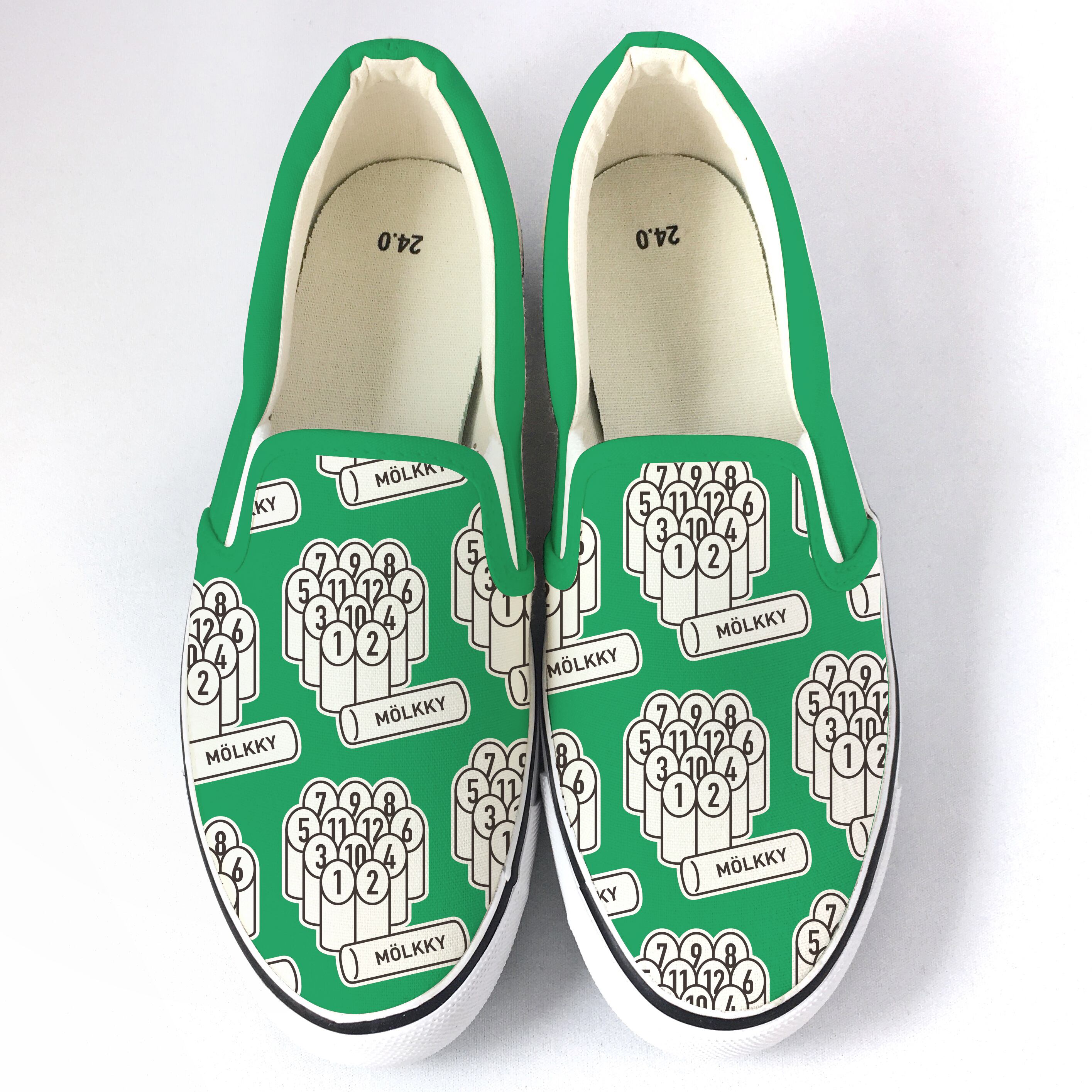 フィンランドのスポーツ『Mölkky(モルック)』柄をスリッポンにハンドペイントしたLACICO(ラシコ)のオリジナル作品です。