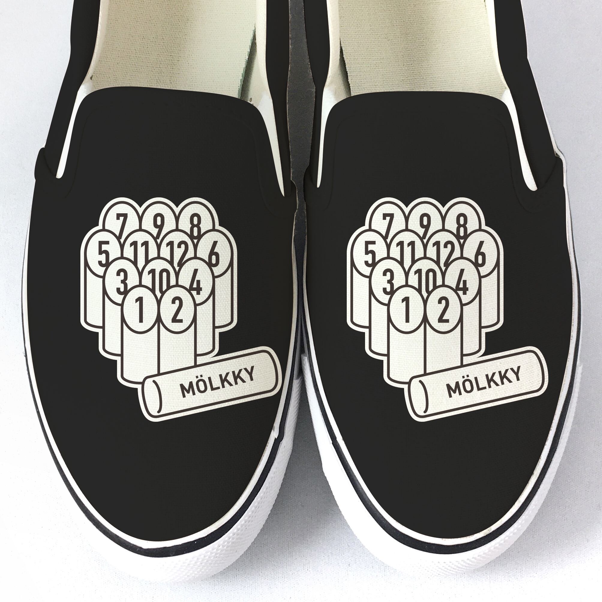 フィンランドのスポーツ『Mölkky(モルック)』柄をスリッポンにハンドペイントしたLACICO(ラシコ)のオリジナル作品です。