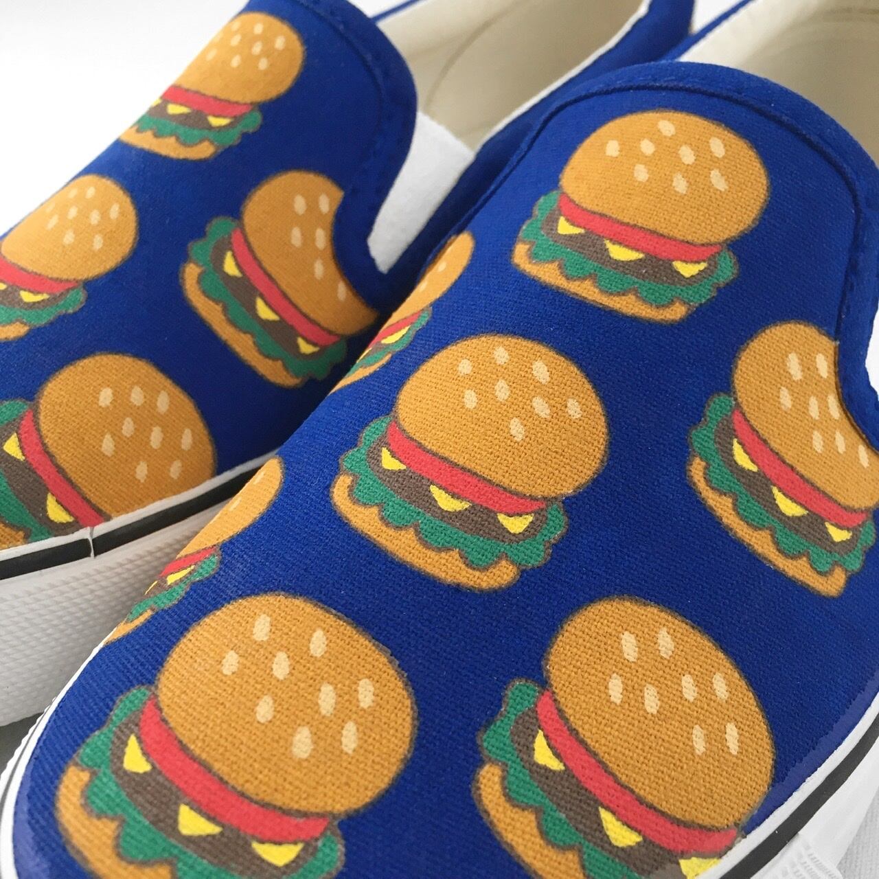 キャンバススリッポンに、手描きで『ハンバーガー柄』をペイントしたLACICOオリジナルハンドペイント作品です。