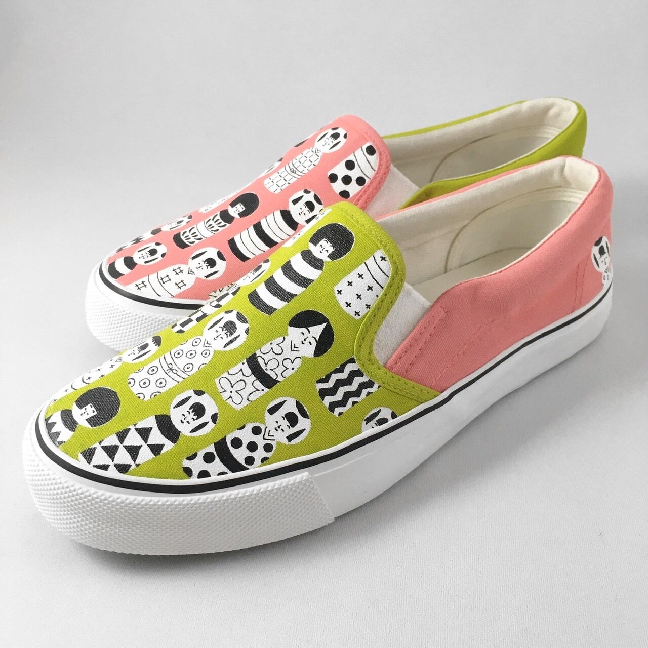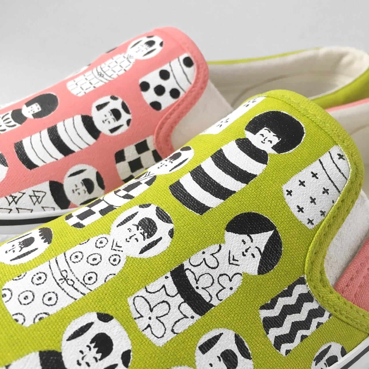こけしそれぞれに異なる模様と表情があり、見ているだけで楽しくなるようなユニークなスリッポンに仕上がりました。