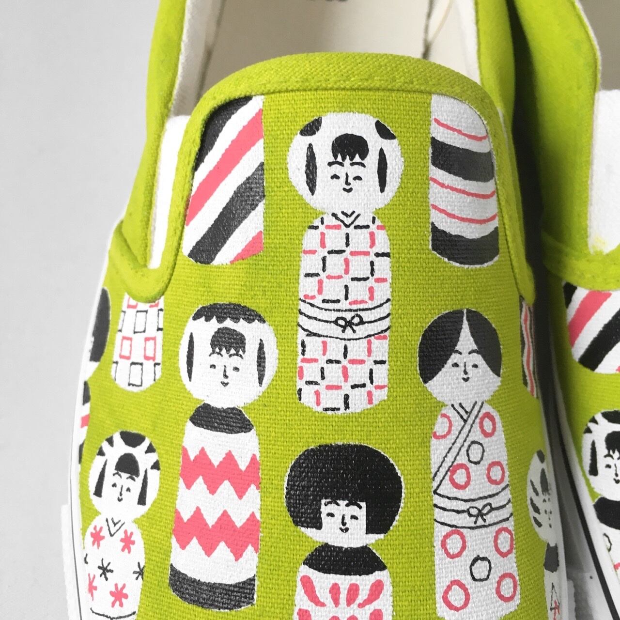 キャンバススリッポンに、手描きで『こけし柄』をペイントしたLACICOオリジナルハンドペイント作品です。