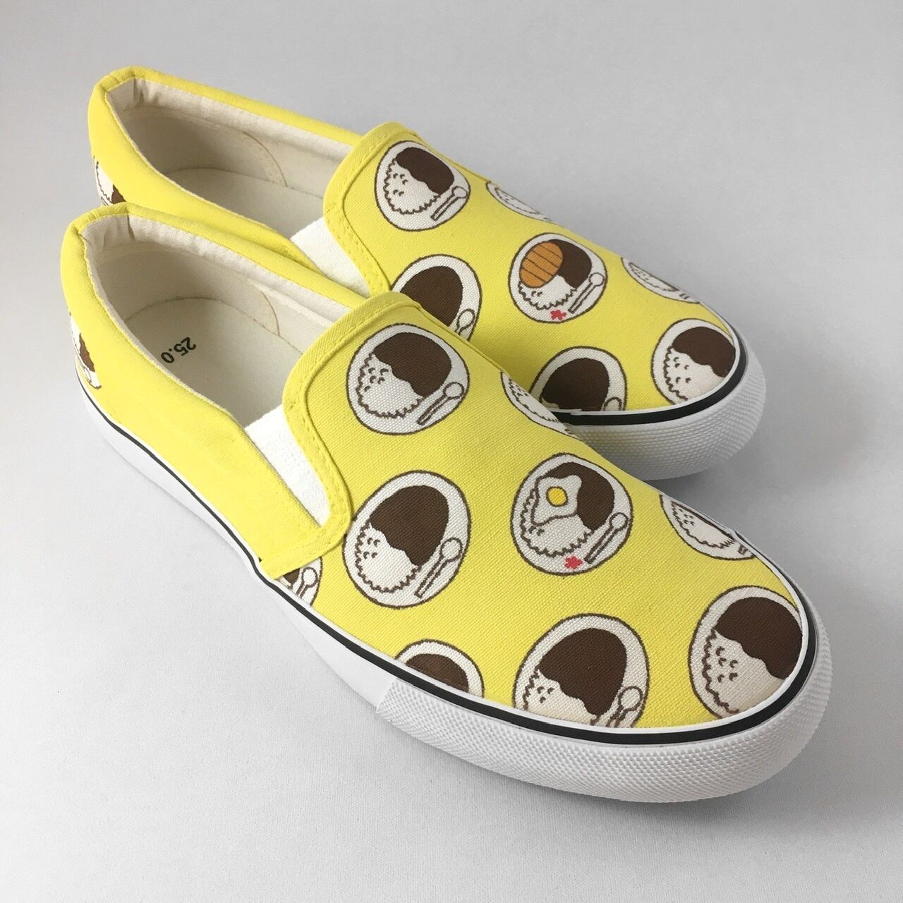 キャンバススリッポンに、手描きで『カレーライス柄』をペイントしたLACICOオリジナルハンドペイント作品です。