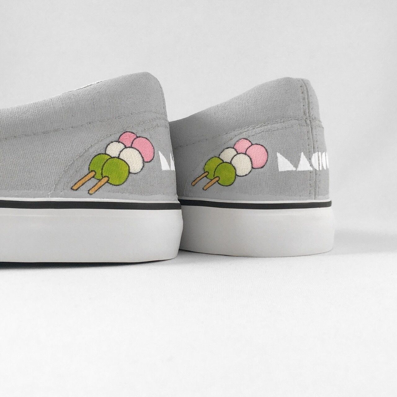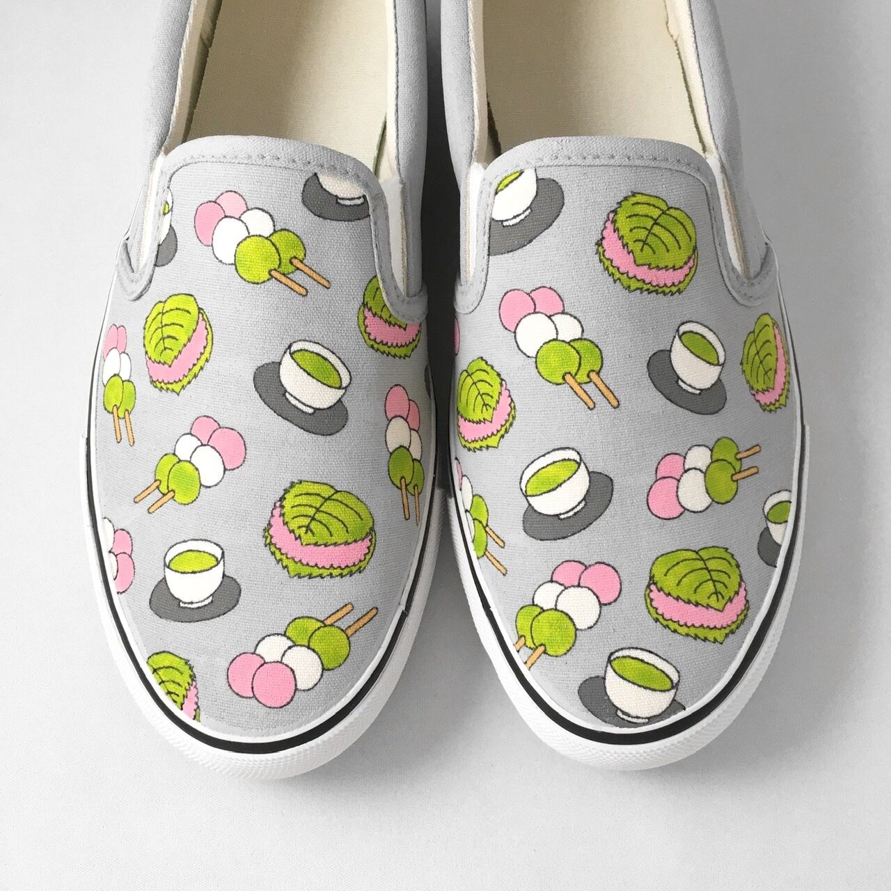 キャンバススリッポンに、手描きで『和菓子柄』をペイントした【LACICO(ラシコ)】のオリジナル手描きスリッポン作品です。