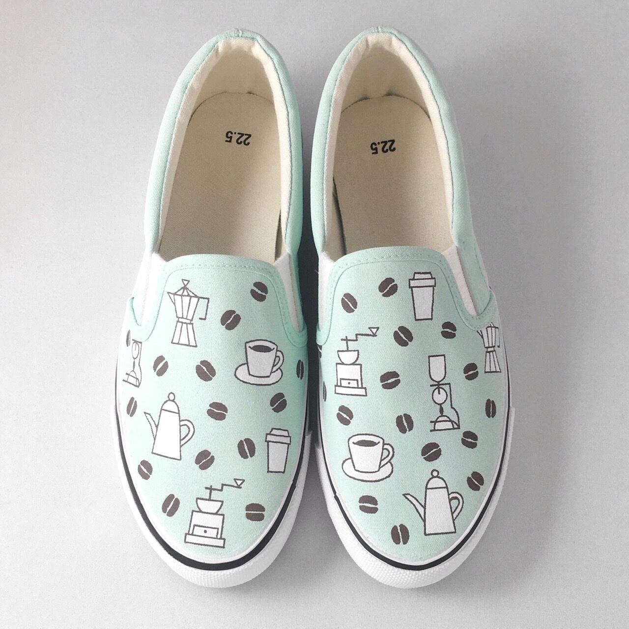 「コーヒーモチーフ」をスリッポンにハンドペイントした『LACICO(ラシコ)』オリジナル手描き作品です。