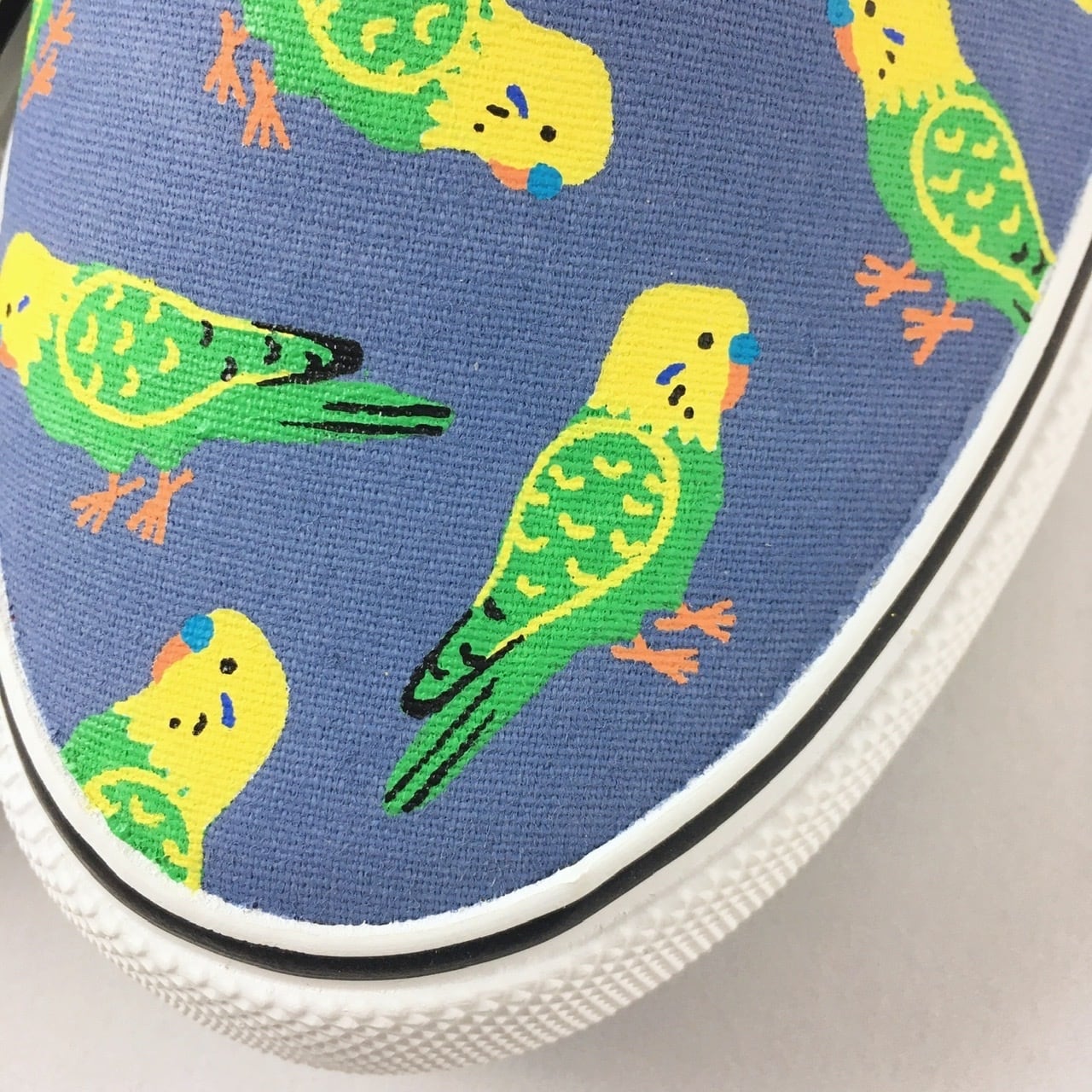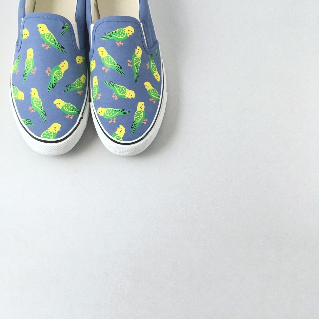 キャンバススリッポンに、手描きで『セキセイインコ柄』をペイントした【LACICO(ラシコ)】のオリジナルハンドペイント作品です。