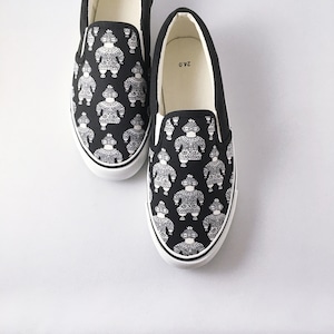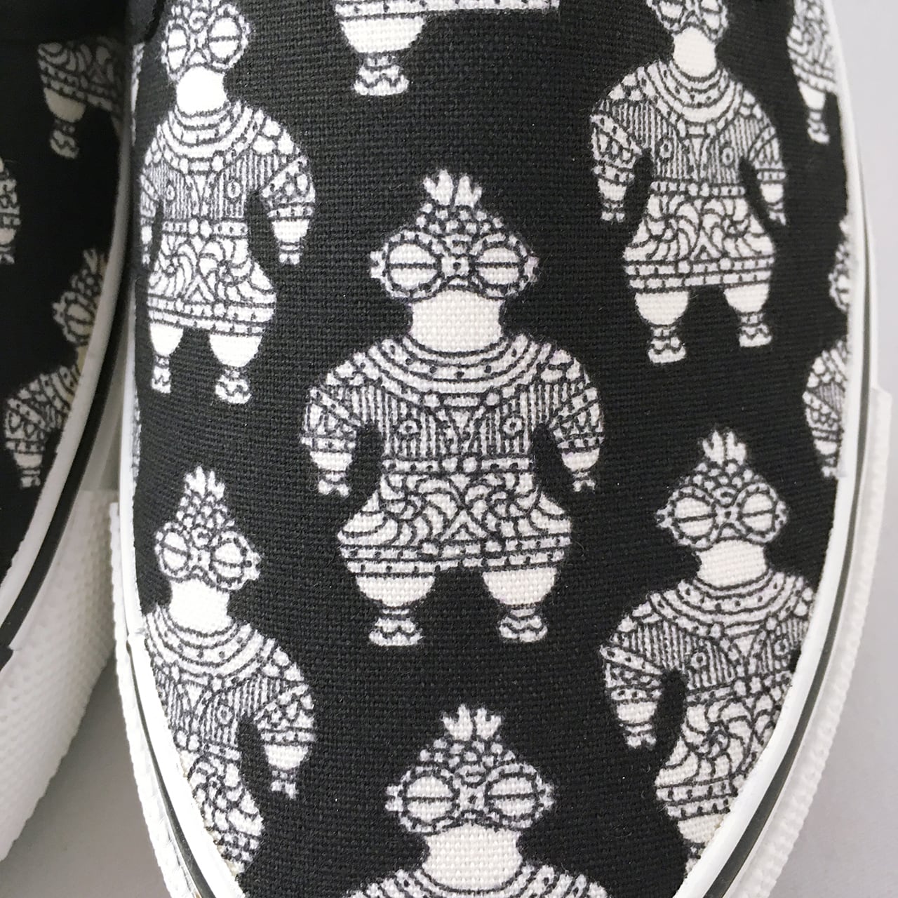 こちらは「土偶」をモチーフに細部まで繊細に描いた作品で、シュールな存在感を放つ個性的なスリッポンに仕上がっています。